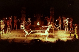 Transported back 50,000 years you enter a time tunnel and are carried on a journey back to the beginning of Godwanaland (Australia) Bubbling mud ponds, a giant crocodile and mud men greet you in a prehistoric rainforest environment. Strange sounds are heard from beyond, a large camouflage door opens and a dinosaur bids you enter. Now in a rainforest amphitheatre you are bewildered by a strange dance performed by prehistoric animal dancers, followed by the world renowned Tjapukai. At the conclusion a tribe of warriors from a distant era deliver a feast fit for a king. At the conclusion of the feast the volcano erupts, complete with explosions and fire.